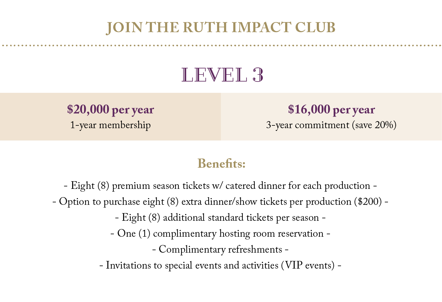 By becoming an Impact Club member, you are investing in the profound impact theater has on our community, our performers, and our youth all while enjoying exceptional perks such as premier season tickets, catered events, and a host of other benefits. Our Impact Club members play a crucial role in ensuring that the theater we produce at The Ruth Theater will continue to be world class and affordable - two statements you do not always hear together. Come be a part of our grand new beginning.